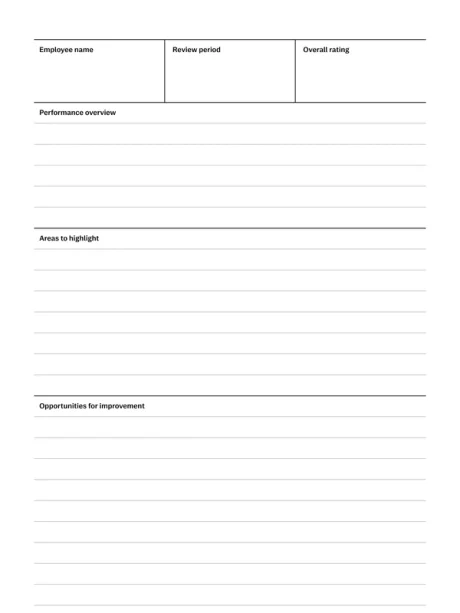 This template offers a clear format for organizing feedback when you’re doing peer reviews. It includes key prompts and has sections for highlighting strengths and identifying areas for improvement. After you’ve filled out the template, use it to share feedback with your coworkers, for example in performance review meetings.
